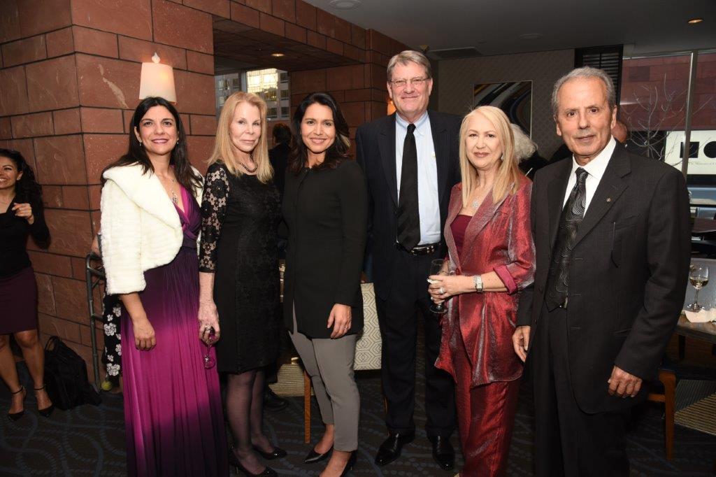 Tulsi Gabbard at the 2019 AHC Awards Gala along with Consul General of Greece Evgenia Beniatoglou, AHC Benefactors Demos & Carol Anagnos, and Honorary Consul General of Cyprus Andreas Kyprianides with spouse Mika