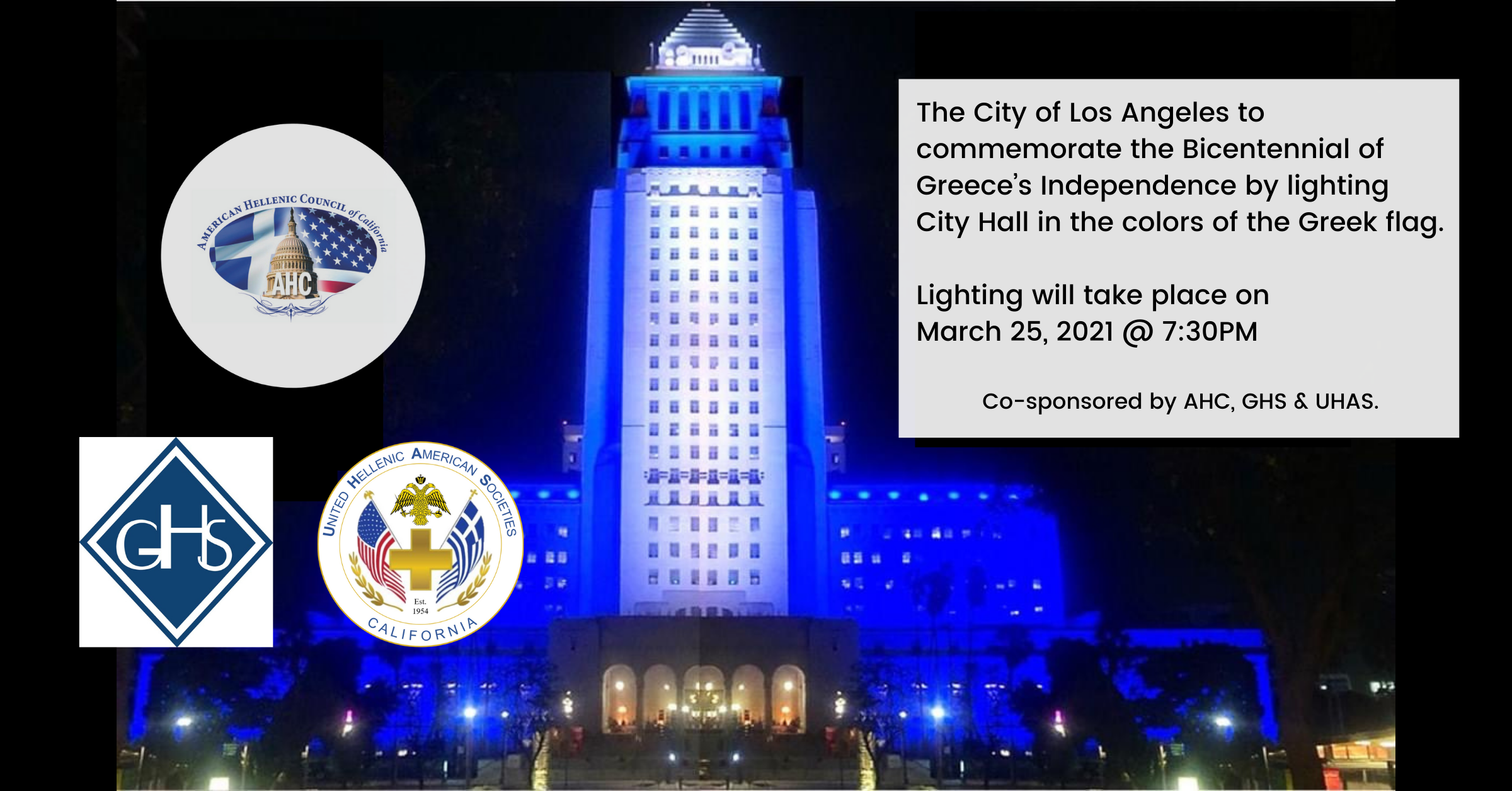 It is with this keen sense of patriotism and friendship that the American Hellenic Council and the City of Los Angeles commemorate the 200 Years of Freedom as we light Los Angeles Hall in the Greek colors of blue and white on the week of March 25th, 2021.