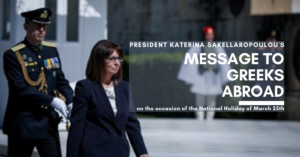 Message From the President of the Hellenic Republic, Katerina Sakellaropoulou To the Greeks abroad, on the occasion of Greek Independence Day of March 25th My dear compatriots, Greek women and Greek men abroad, It is with great pleasure that I address you today, the Greeks abroad, for