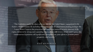 On December 20, 2019 The Eastern Mediterranean Security and Energy Partnership was signed into law by President Trump. The bill was co-authored in the Senate by Robert Menendez (D-NJ) and Mark Rubio (R-FL) as SB 1102, while in the House, H.R. 2913 was sponsored by Gus Bilirakis (R-FL) and David
